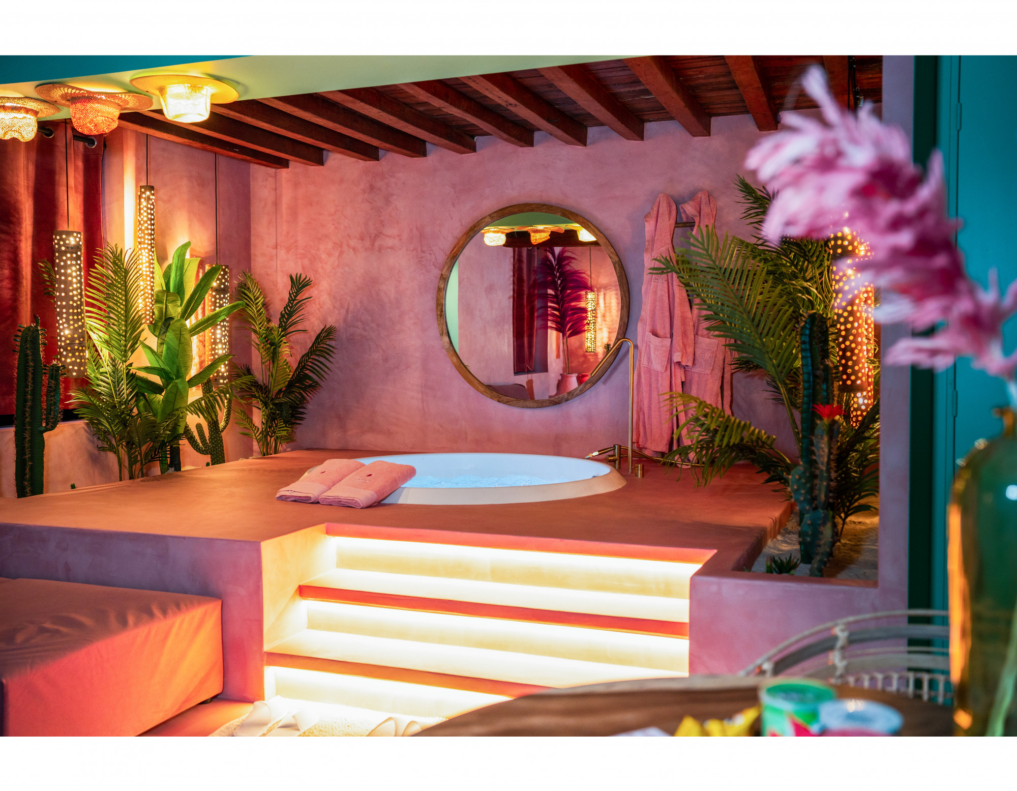 Qui n’a pas envie de s’envoler pour Cuba ou pour Tulum en un claquement d’accélérateur ? La suite La Bonita avec sa déco en béton ciré rose vous plonge dans un univers coloré chaud, rempli de fantaisie et de poésie. La suite La Cabana vous donne rendez-vous au Mexique, haut lieu de l’exotisme. Une fois l'esprit captivé par les images d'un ailleurs, c'est au corps de trouver son équilibre en profitant des bienfaits de la balnéothérapie et/ou du sauna. La douche italienne et le lit King Size 2 personnes vous assurent une excellente nuit. Différentes formules vous seront proposées pour que vous puissiez dîner autour d’une planche apéro, de la formule « del amor » qui prévoit les pétales de rose dans la chambre, le champagne, les bougies et un bouquet de fleurs. Vous pourrez compter sur le savoir-faire de Justine pour répondre à toute autre demande de personnalisation de votre séjour.